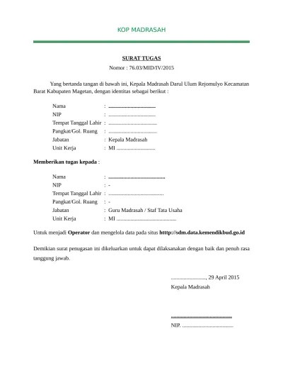 Operator/admin website desa leranwetan kecamatan palang kabupaten tuban mempunyai tugas : Kepala pendidikan pkbm buana mekar . Terpadu kesejahteraan sosial, perlu ditetapkan petugas operator desa/kelurahan pelaksana kegiatan. Contoh sk dan surat tugas operator emis lembaga tpq, madrasah diniyah dan pondok pesantren. Berikut ini kami berikan contoh sk operator emis. Dalam pendaftaran email sebagai identitas diri (id) . Silahkan di download dan diedit sesuai dengan sekolah yang bersangkutan. Text of contoh sk operator emis.docx. Contoh surat keputusan tpq dan diniyah dari yayasan atau lembaga yang menaungi dan masjid. Jalur pembuatan izin operasional tpq, lpq,tpa.