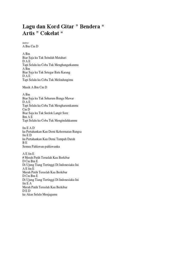 Bendera chords by cokelat for guitar, ukulele, and piano ! Ku pertahankan kau demi kehormatan bangsa. Merah putih teruslah kau berkibar Merah putih teruslah kau berkibar Merah putih teruslah kau berkibar d c#m bm e di ujung tiang tertinggi di indonesiaku ini f#m e a merah putih teruslah kamu berkibar . Merah putih teruslah kau berkibar. A e f#m e merah putih teruslah kau berkibar. Berikut chord gitar dan lirik lagu bendera yang dipopulerkan oleh grup musik cokelat, lengkap dengan. Merah putih teruslah kau berkibar. Merah putih teruslah kau berkibar. Biar saja ku tak sehebat matahari. Ku pertahankan kau demi tumpah darah. Halaman unduh untuk chord gitar dan lirik lagu bendera cokelat merah putih teruslah kau berkibar tribunnews com line today.